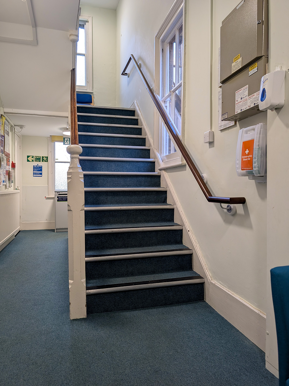 - There are external steps up to the entrance. The steps have handrails both sides. There are visually contrasting markings on the step edges