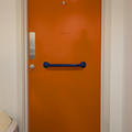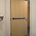 - The door has a clear width of at least 80cm and is an inward opening door. The door is moderately heavy.