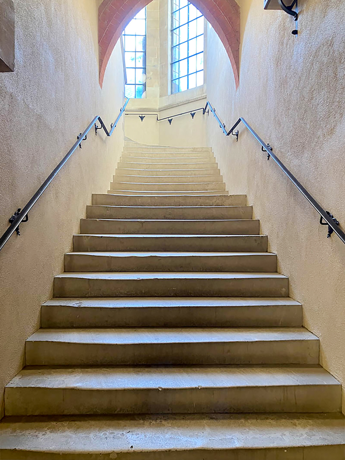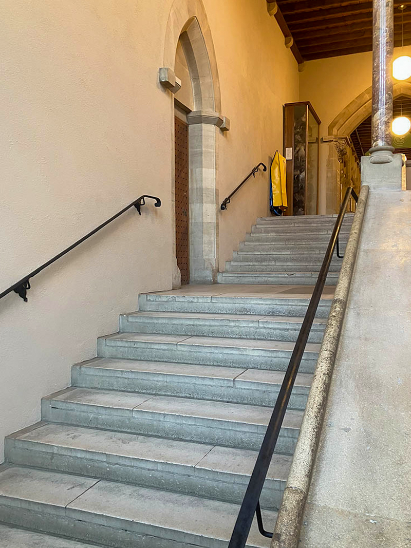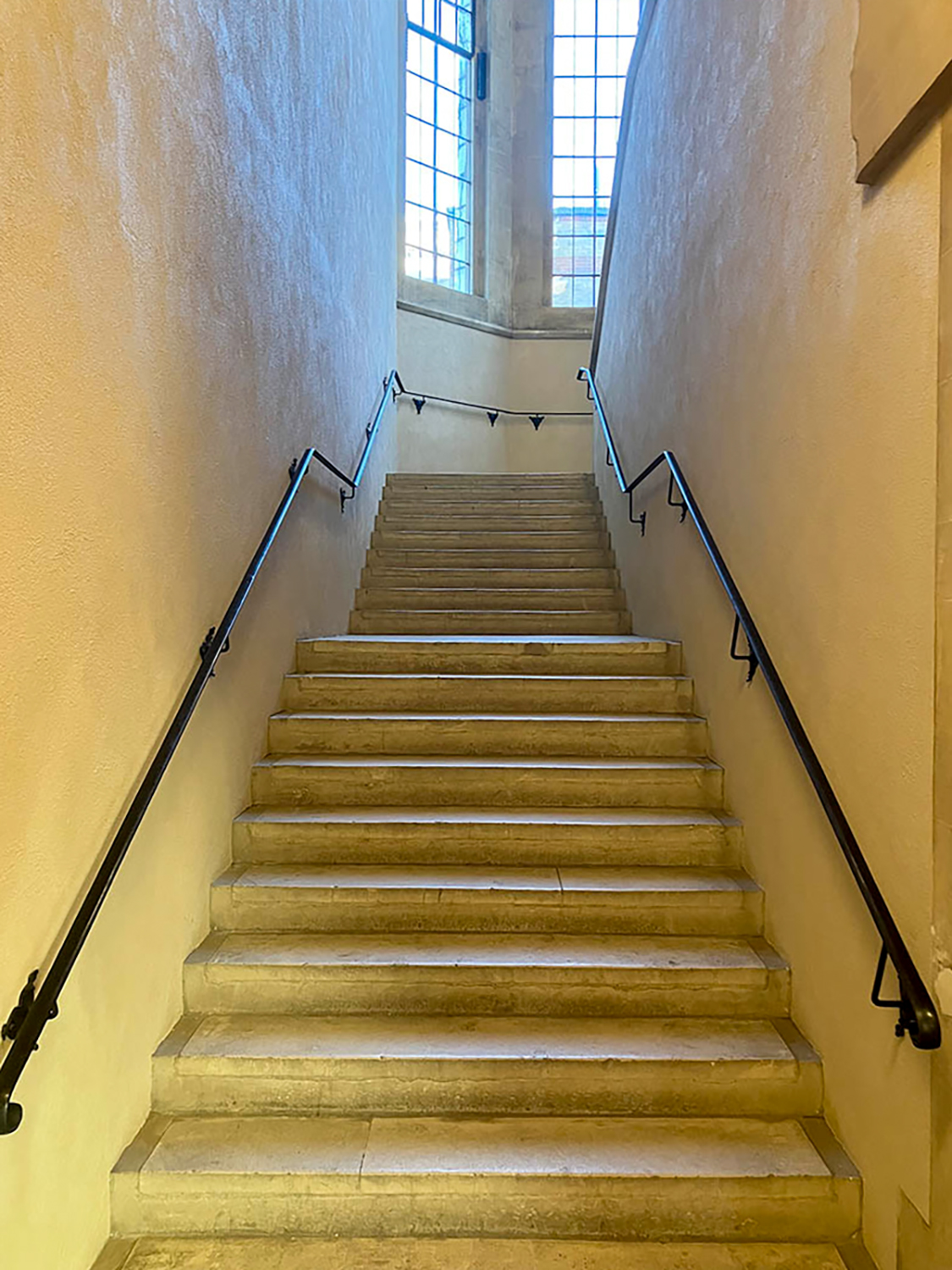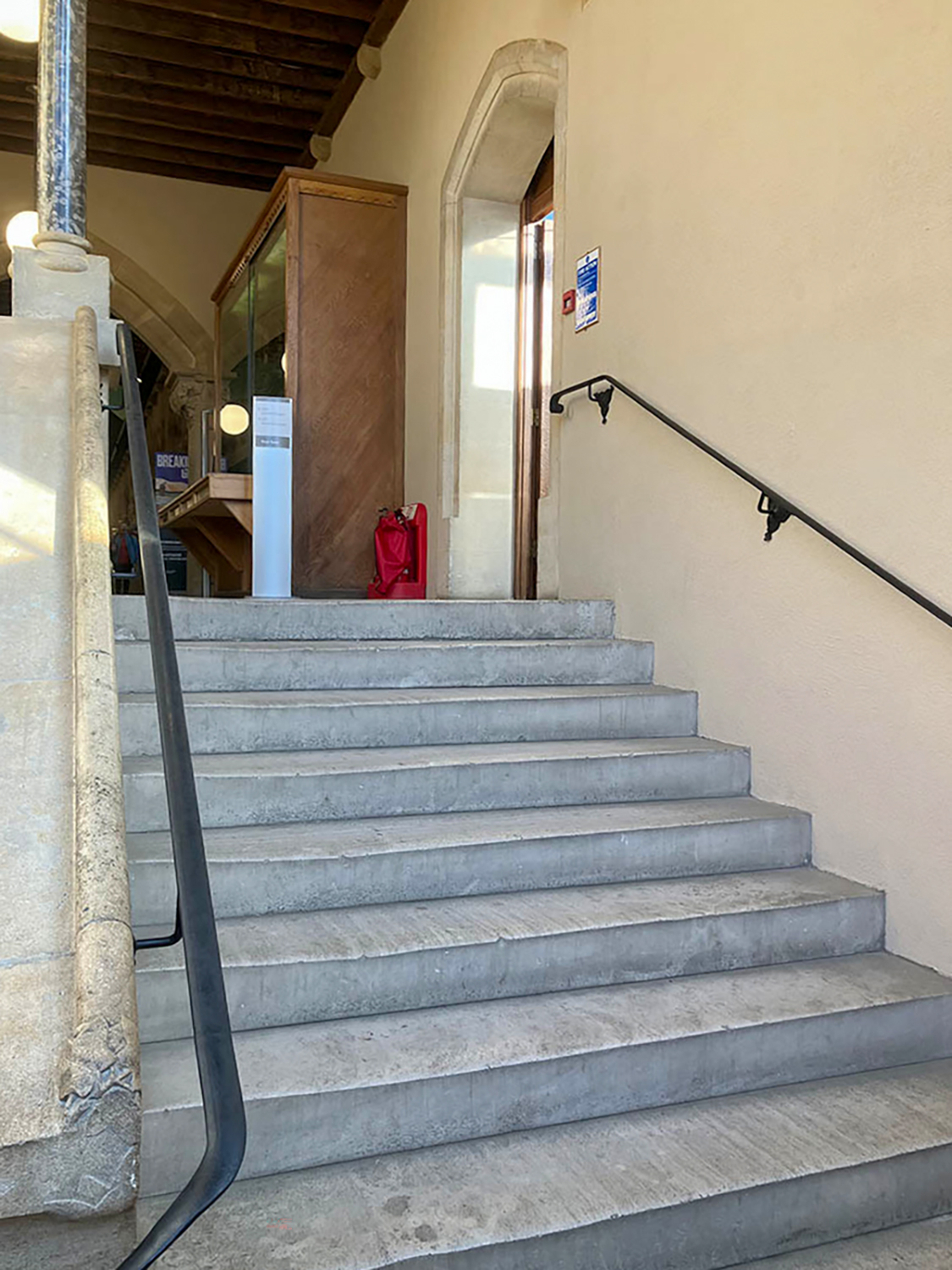 Inside the main entrance lobby, there are stairs up to the ground floor level. The stairs here are stone, wide, worn in places and have a central handrail only.