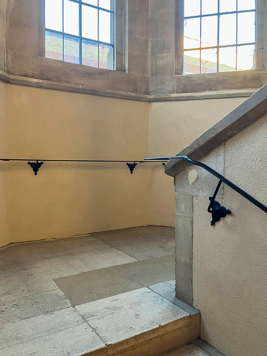 From the ground floor, there are continuous handrails (both sides) up to a half landing which has no rails. From the landing to the first floor there is a partial handrail to the left (ascending) and a stone bannister  to the right (ascending) which some people may find harder to grip.