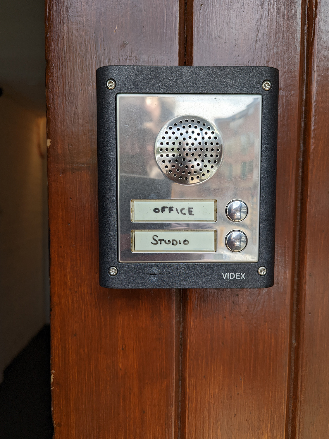 There is no reception in the building. If you have an appointment outside of performance times, then you can use the intercom to alert a member of staff to your presence outside. The intercom is placed at 1.5 m high next to the entrance door inside the covered porch; there is a step up to the porch.