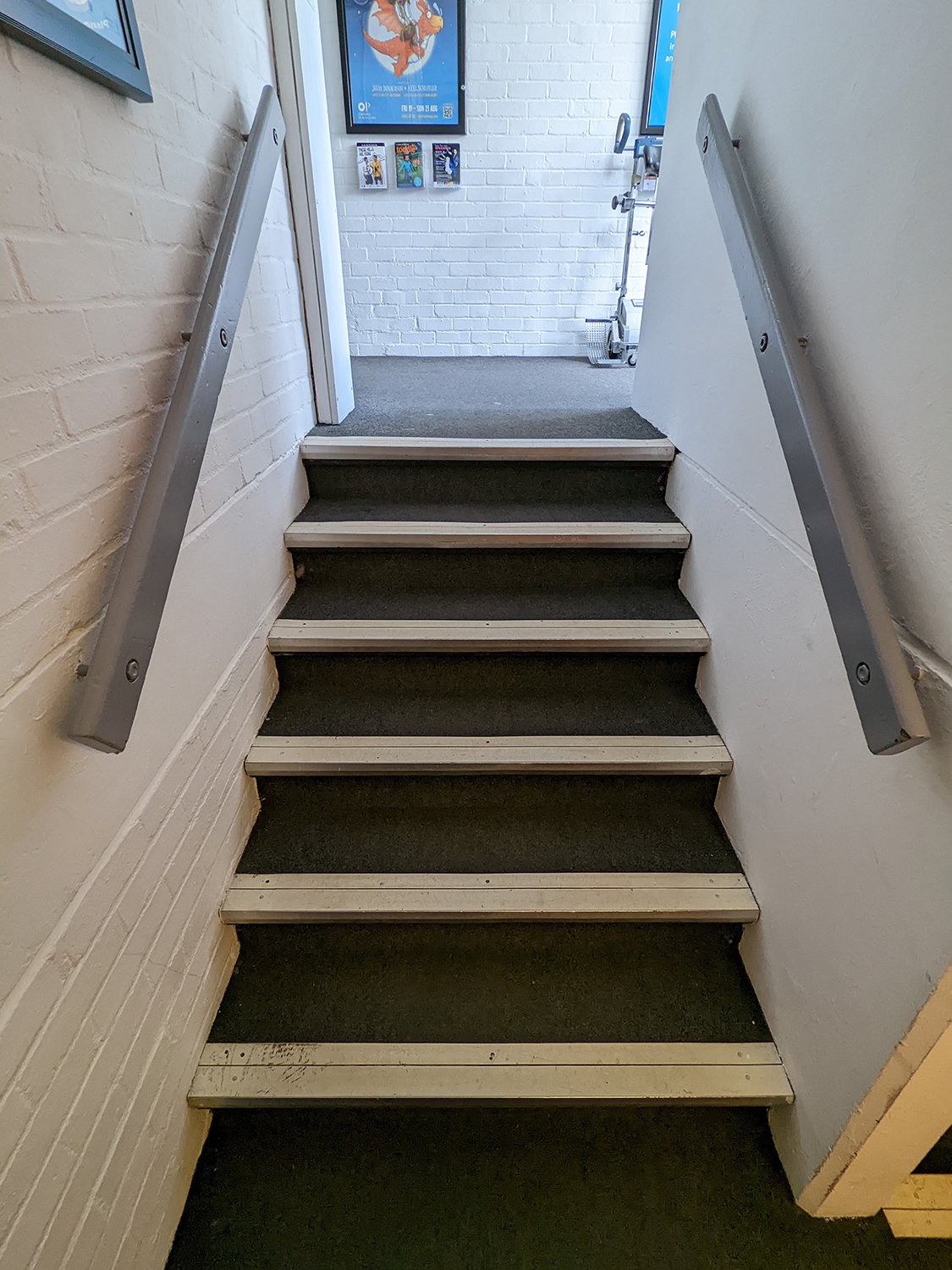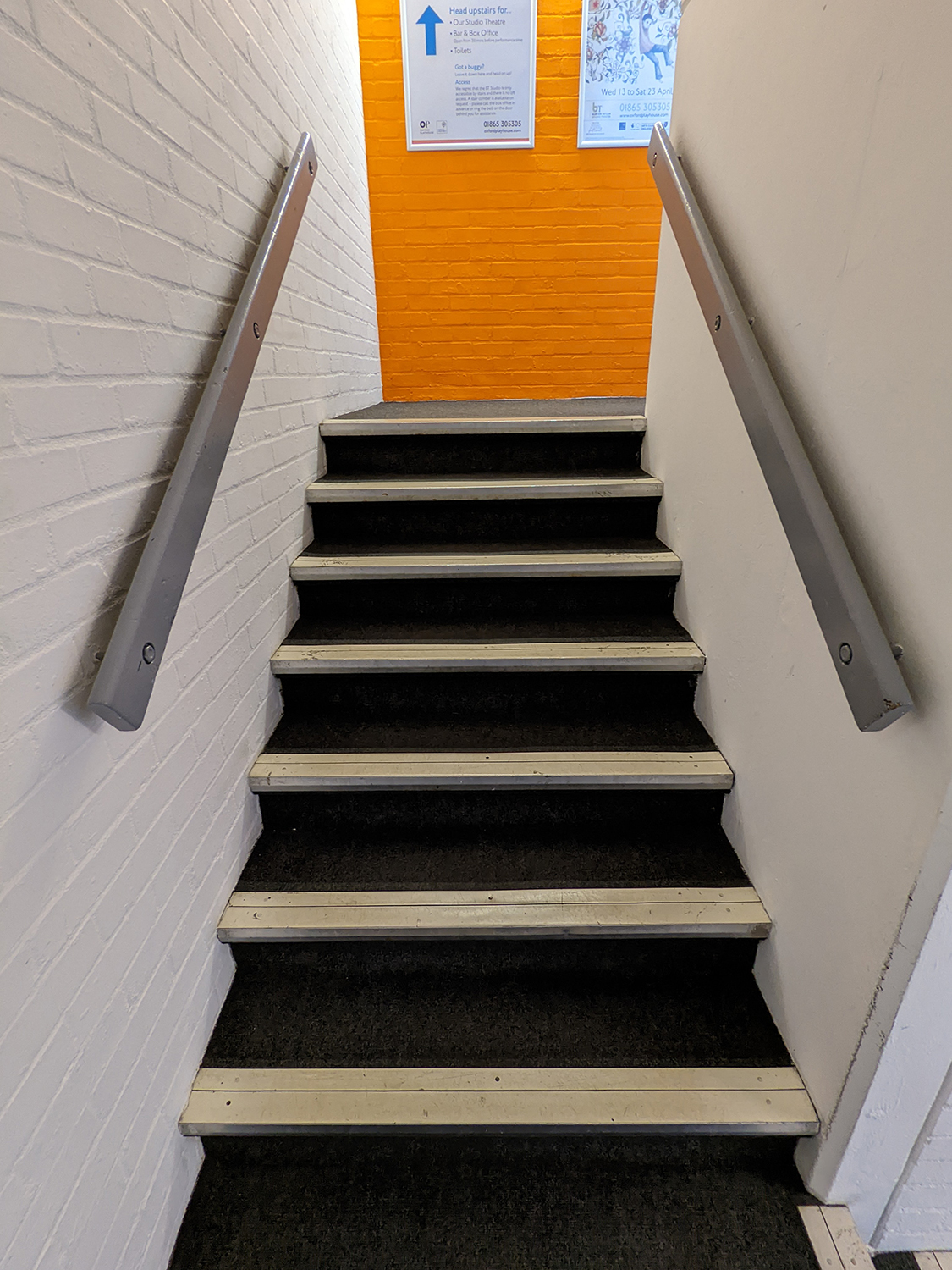 The first section of stairs up to the landing have contrasting step edges and handrails both sides. There are no handrails around the landing. The final section of stairs to the second floor has contrasting step edges and handrails both sides. The theatre space is on the second floor.