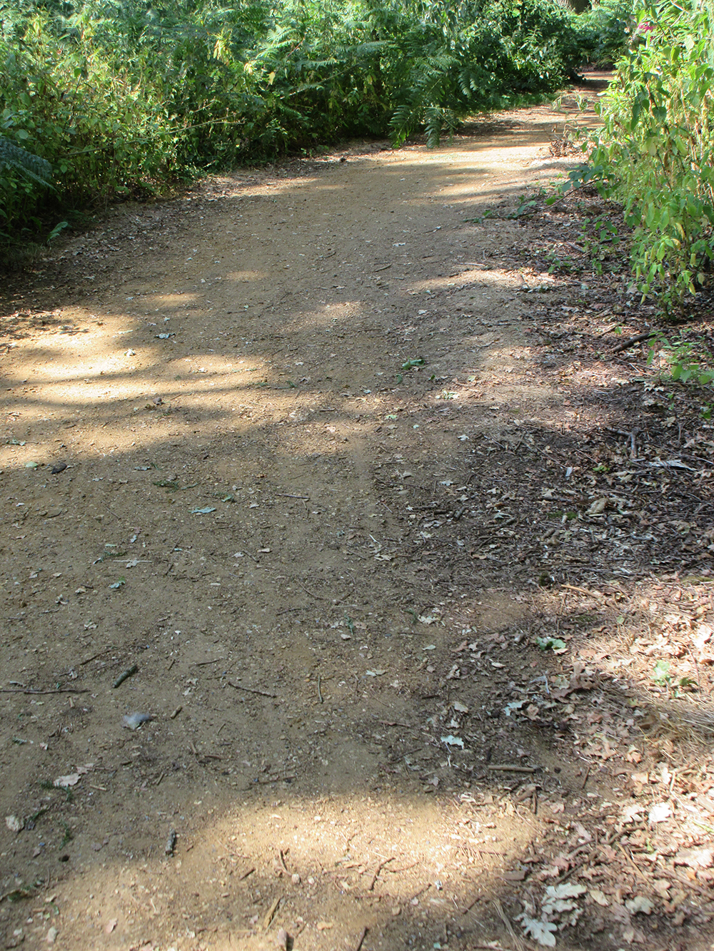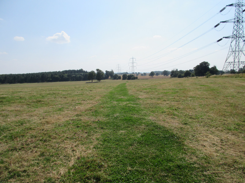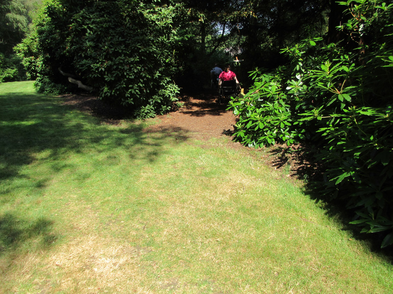 These are worn paths across the grass for visitors, although they are not very clearly marked. The ground is uneven, but the grass is quite short, so it might be possible to use some of them with a wheelchair if you are careful. The grass paths across the meadow are harder work due to the slope of the site and the longer grass. Earth paths across the parkland are largely quite steep, and the ground is more soft.