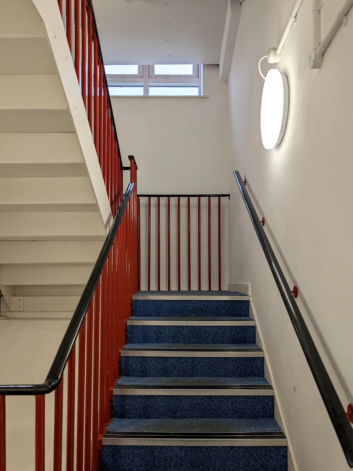 - The stairs have a handrail to the left (ascending) and no handrail to the right. There is strong visual contrast on the step edges.