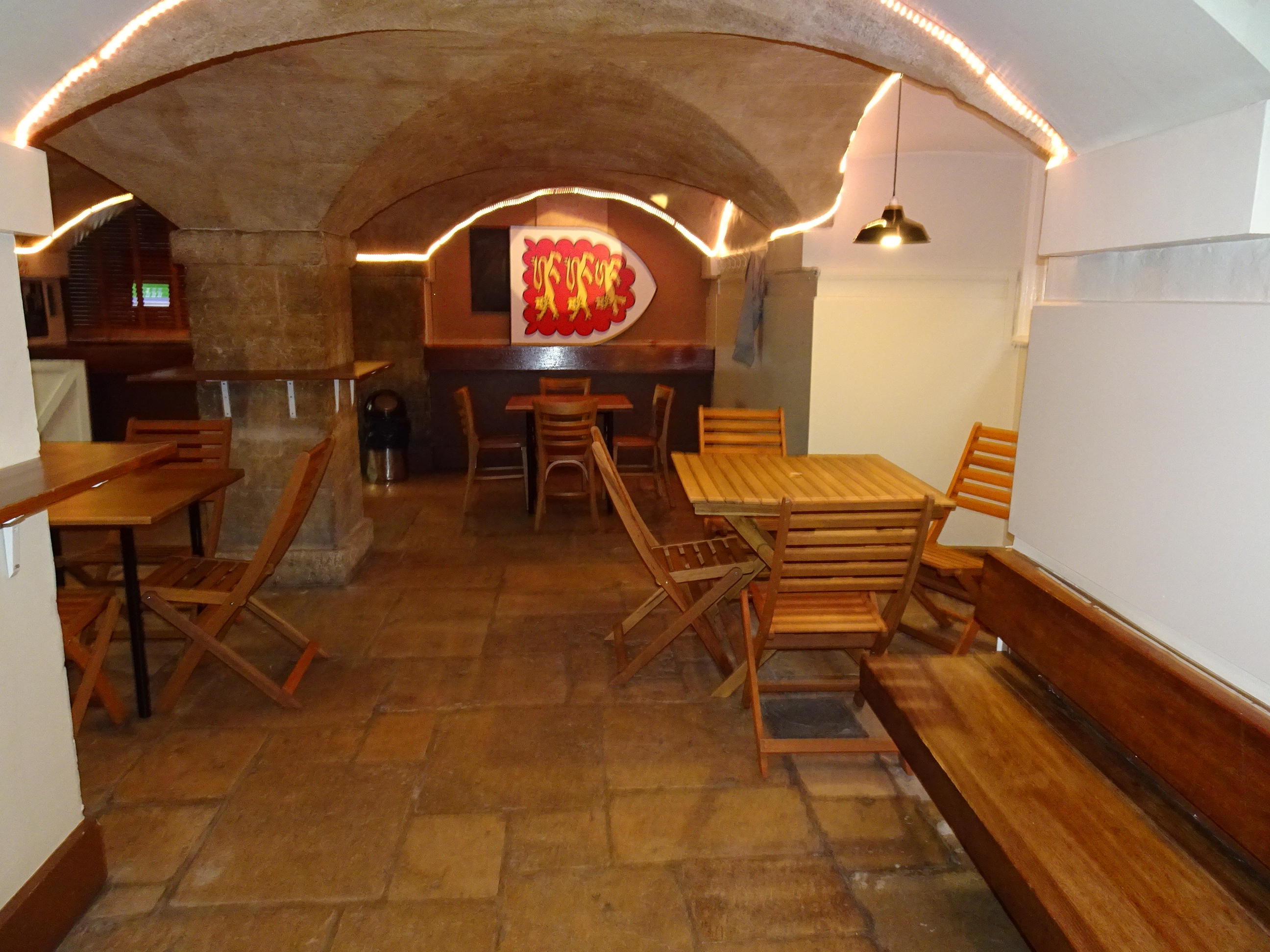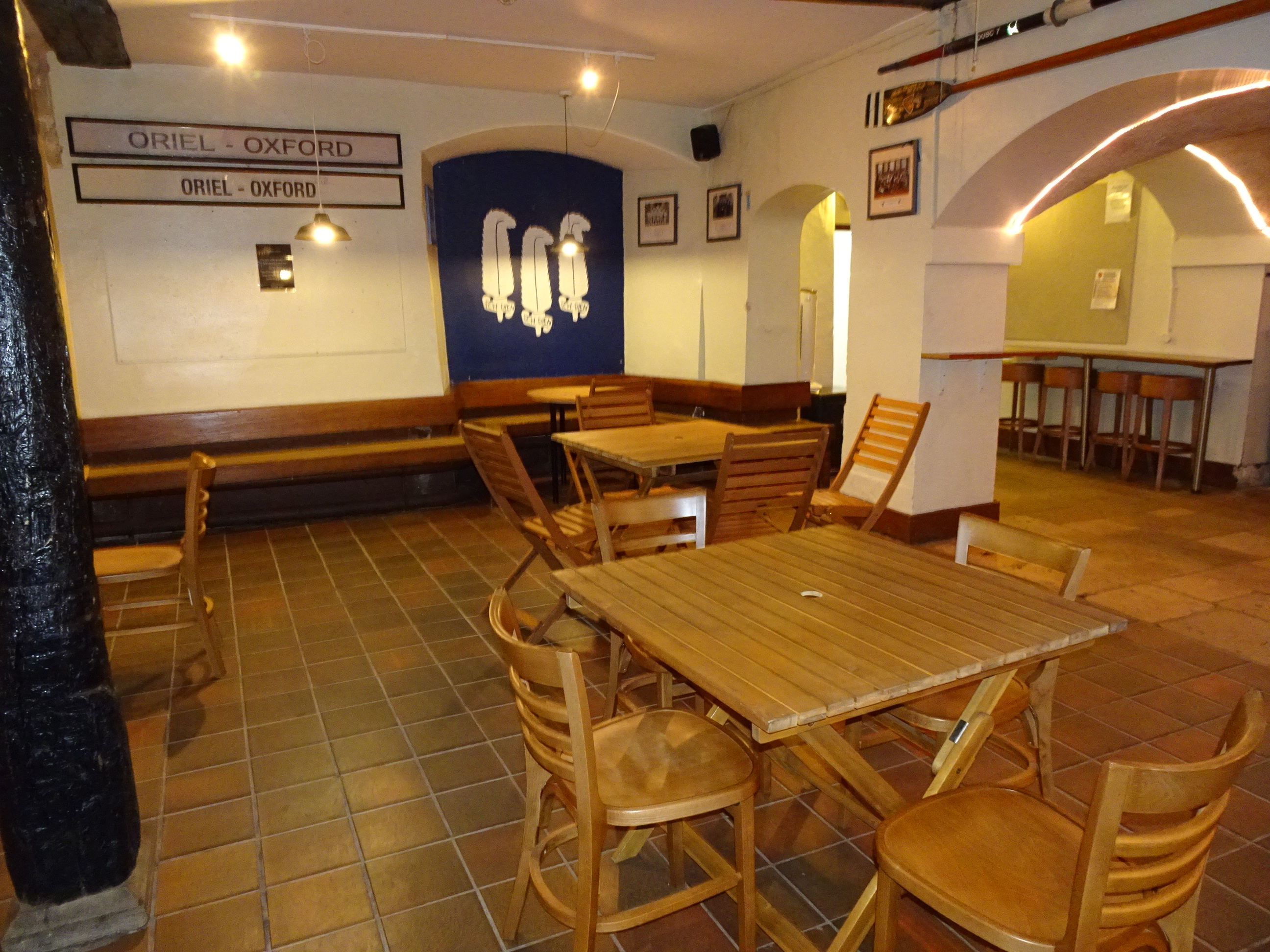 The College bar is on the main site in the basement and can only be reached by stairs. There are two doors on the stairs. One opens to 105 cm and the other to 90 cm. The underside of the tables is 70 cm from the floor. The bar counter is 101 cm from the floor. There is an opening in the counter for staff. There is room to manoeuvre a wheelchair although this may be more difficult at busy times.