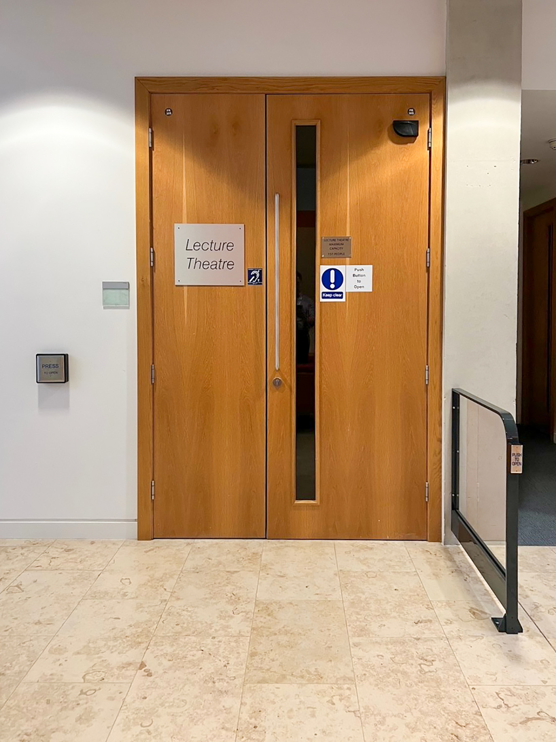 Aside from the main entrance and lifts, all doors in the building are manually operated. Most doors have vision panels and well placed contrasting handles. Some doors are access controlled - swipe card readers are at an accessible height for wheelchair users.