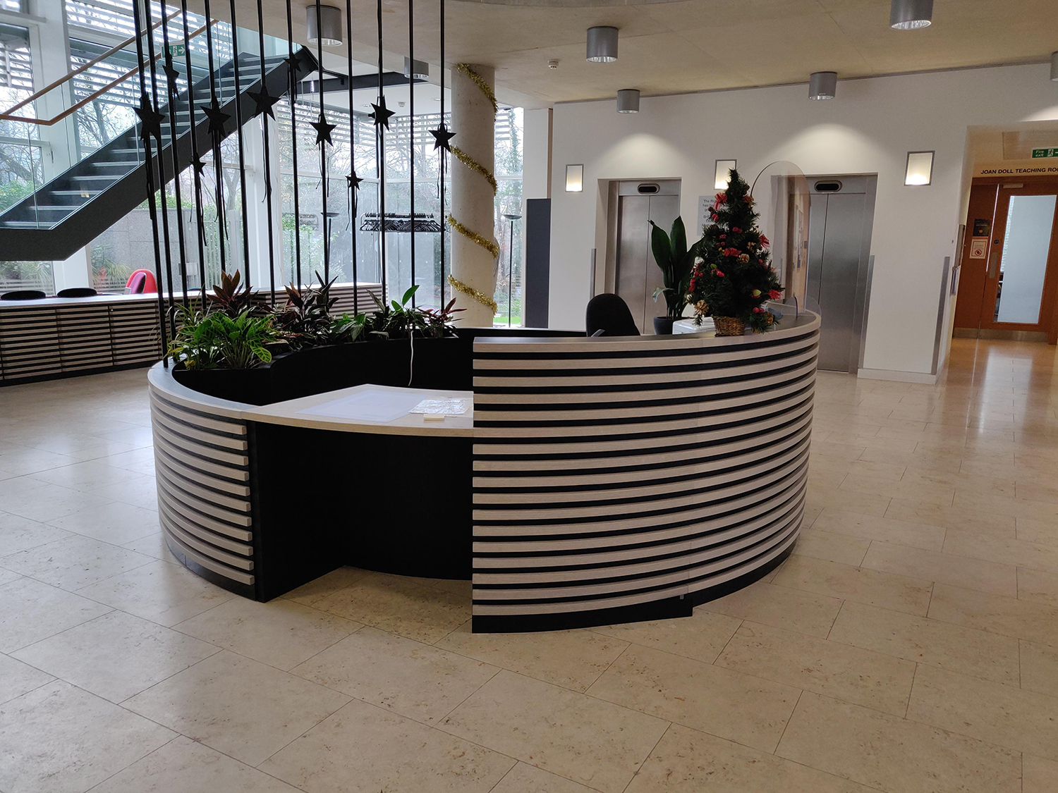 As you enter the building the reception desk is ahead of you. This is staffed between 8 am and 4.30pm Monday to Friday. The desk is curved and has two wheelchair accessible sections, both with a knee recess.