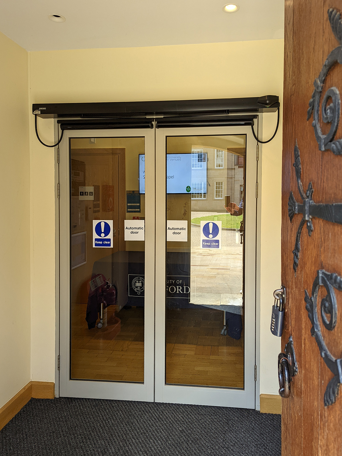The surface leading towards St Luke's is firm and level. There is a gentle ramp leading up to the entrance. The ramp is wide, and does not have handrails. There are double doors, which are usually held open during events giving a clear width of 1.4 m. This leads into a small entrance lobby and a second set of double doors - these are automated and have a clear width of 1.2 m. These lead into a small foyer with access to the WCs and the main event space.