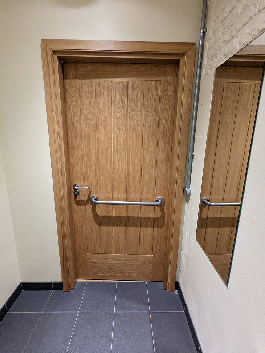 The outer entrance double doors are usually held open during events giving a clear width of 1.4 m.