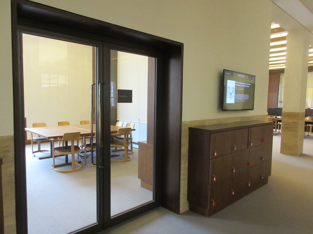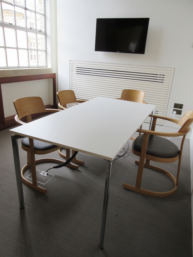 The smaller meeting rooms are at the right-hand side of the enquiries area. This is the large space directly opposite the lift lobby. These rooms, (the Sassoon and the Bon Christiano), both accessed through single doors. While these are smaller than the main room, the setup is identical, with display screens, a large central table and moveable chairs (although there is less space available around the edge of the room). There is hearing support available in both of these rooms, and the rooms are well soundproofed despite one wall being sheet glass. In some cases these spaces can be booked by students with disabilities for private study. Please contact the library staff for further details.