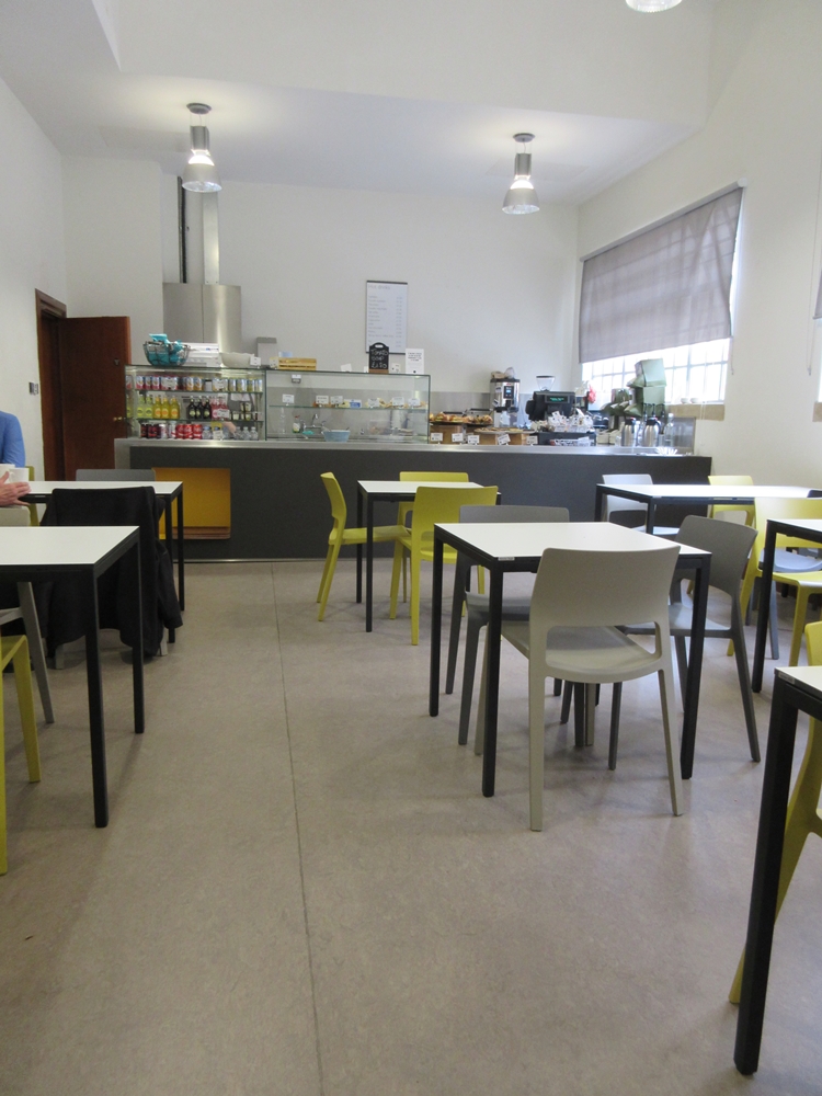 The café is located on Level G.  On the ground floor, go through the entrance lobby and down the corridor to you right.  If you are coming from the lifts, turn left down the corridor.  There are café tables that are a good height for wheelchair users, and plenty of light moveable chairs.  Whilst the serving counter is relatively low height, some wheelchair users may not be able to reach all of the items. The café staff are happy to help if you would like them to.