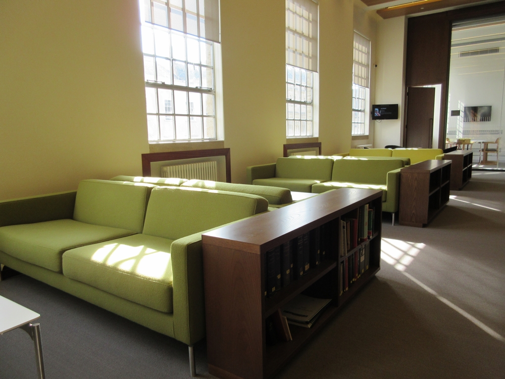 This is located on Level 1. To get there, exit the lift and go out of the door on the left-hand side of the lift lobby. Follow the corridor to your left, and the reading room is the large door on your left-hand side. The first set of doors to access the reading room are manual with large glass panels. These are not heavy, but the member of staff at the security desk will be happy to help you if you need it. The inner set of doors is propped open. This is a long room with rows of chairs, moveable seating, and shelving around the outside. There are two height adjustable desks available. The area is well lit and there is plenty of space to move around, although some of the shelves might be a little high to reach for wheelchair users. The issue desk is halfway down the room on the left-hand side, and is at a comfortable height for everybody. This is always staffed, so please ask if you have any queries.