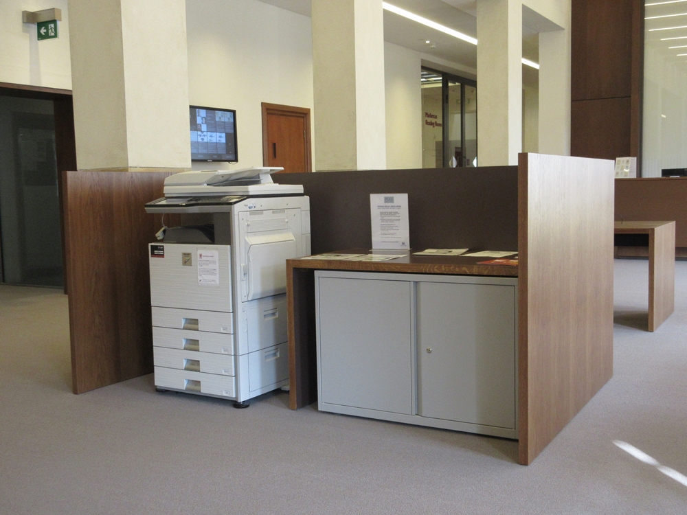 The general enquiry area on Level 1 has a breakout space which readers can use. To get there, exit the lift lobby through the door on the left, and the enquiries area is straight ahead of you. There are several low sofas and coffee tables at the back of the room, and there is plenty of space to park a wheelchair. There is also a PCAS point for photocopying and several catalogue computers, along with a couple of standard use PCs. The desk height is fine for most wheelchairs, but might be a little low for those using larger chairs - please watch your knees!
