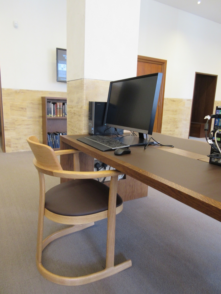 This is located on Level 5.  To get there, exit the lift lobby and turn right.  The reading room is accessed by two sets of double doors, one of which will be held open.  These doors are large, with long visual panels, but are much less heavy than they look!  Once inside the room is well lit, and there are long reading tables with moveable chairs.  The desks will be a comfortable height for most, but there are also height adjustable desks available on the ends of some rows.  The enquiries desk is located at the far end of the room, by the stairs down to the reference area.  The desk is a comfortable height for everyone, and has a hearing support system.